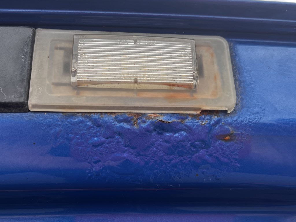 Zwei Dinge sind hingegen unschön: Die Aufnahme der Kennzeichenbeleuchtung hat Rostbläschen. Das ist allerdings nur bei geöffnet Heckklappe sichtbar. Im sichtbaren Bereich gibt es (nicht nur dort) keinen Rost.