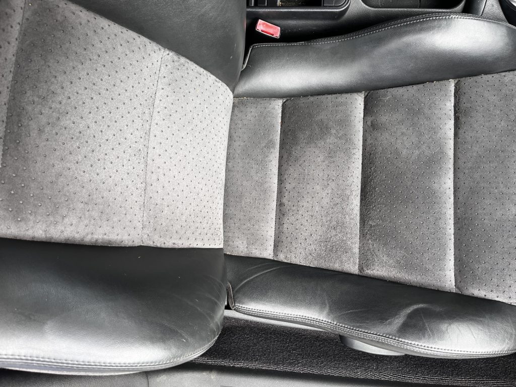 Die Sitzflächen, Sitzwangen sind in sehr gutem Zustand, Lenkrad und auch die Tasten des Radios – ein bekannter Fehler – sind in Ordnung.